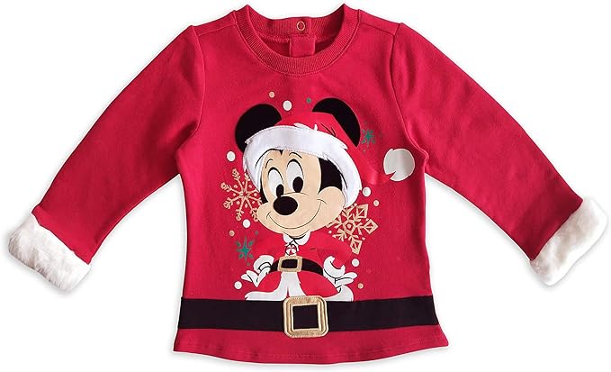 - Shirt features Santa Mickey screen art with hat trim applique, black belt with buckle applique at shirt waist, and three button placket at back