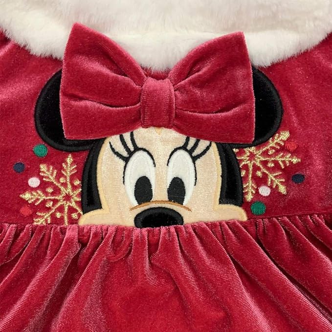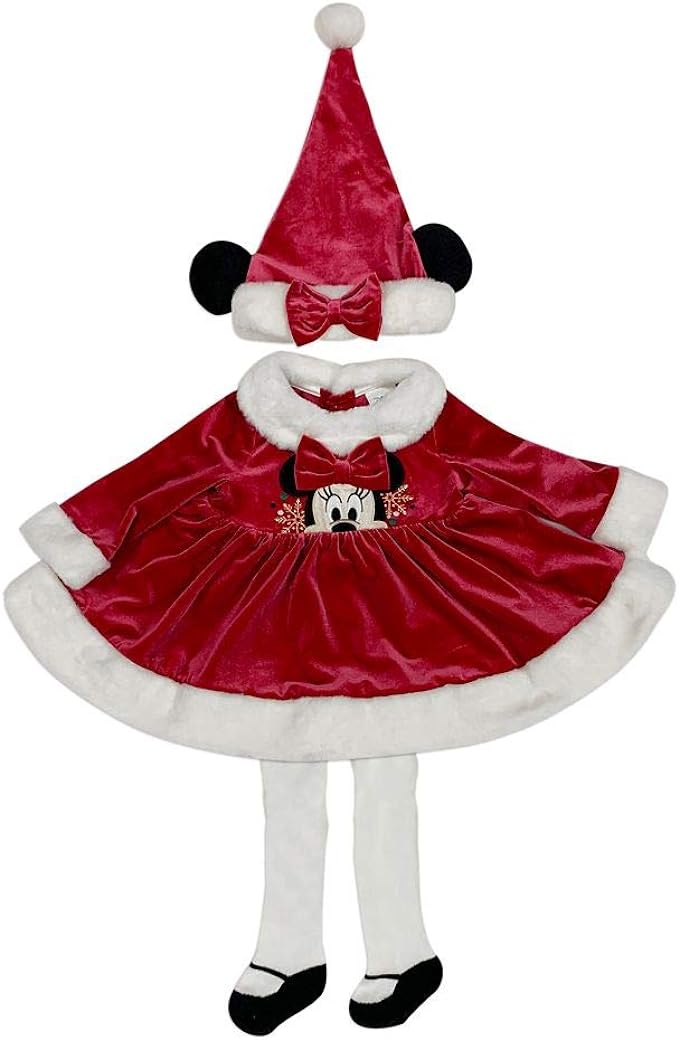 Ho-ho-how cute is this Minnie Mouse Holiday Dress and Hat set? The velour dress is trimmed in faux fur trim and accented with a Minnie appliqué with bow. The hat includes 3D ears, while the stockings feature a Mary Jane shoe print on the feet to complete the classic look.